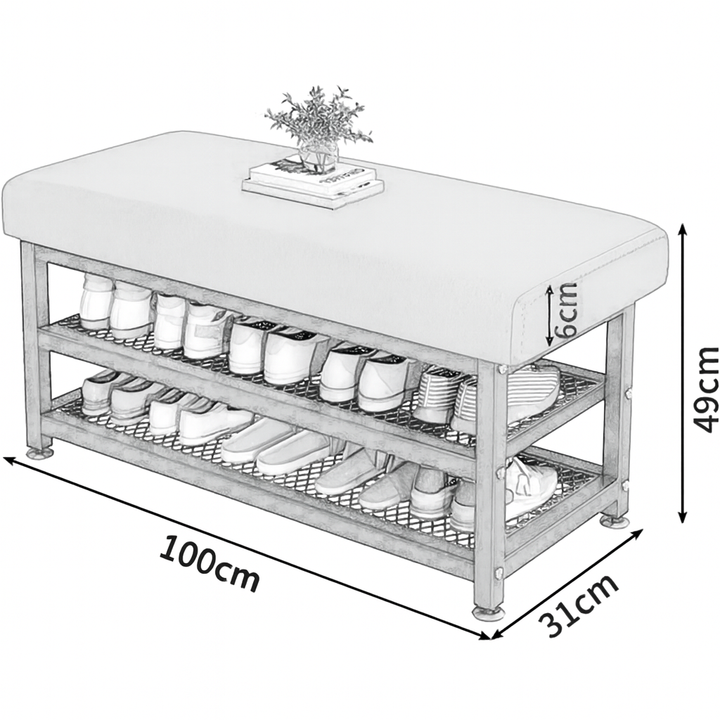 يأتي المقعد بقياس 100 × 32 × 48 سم، مما يوفر مساحة جلوس مريحة ومناسبة أثناء ارتداء أو خلع الأحذية، بالإضافة إلى رف سفلي معدني لتخزين الأحذية بشكل منظم ومرتب.